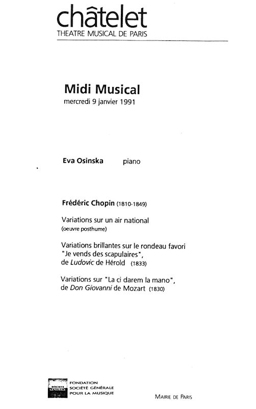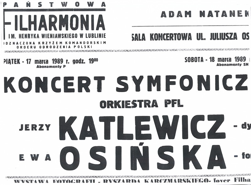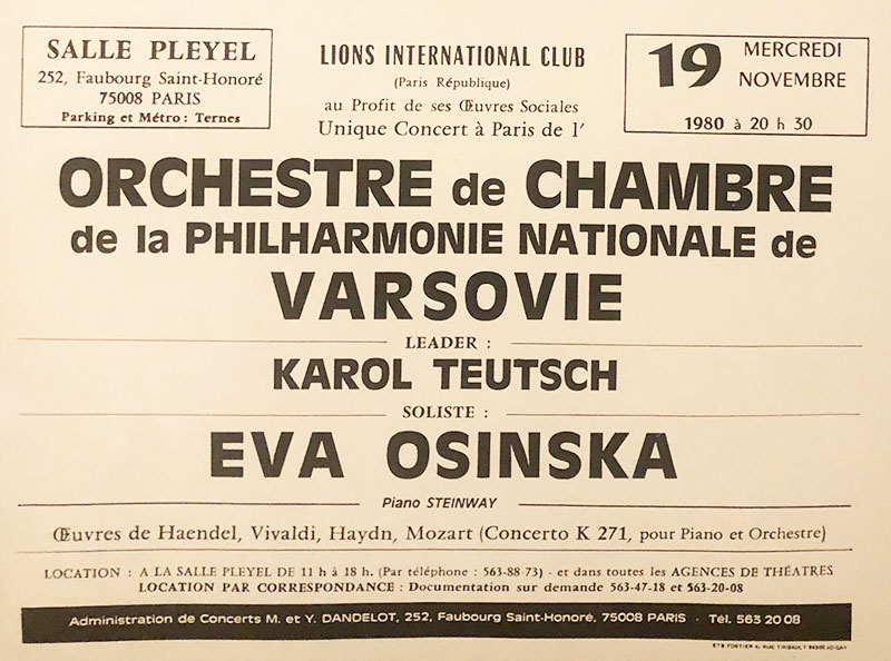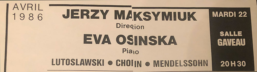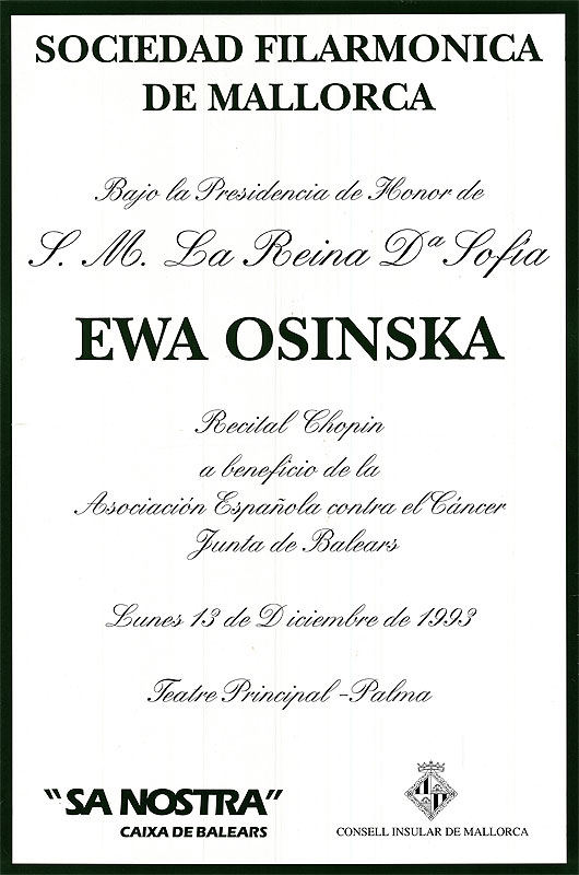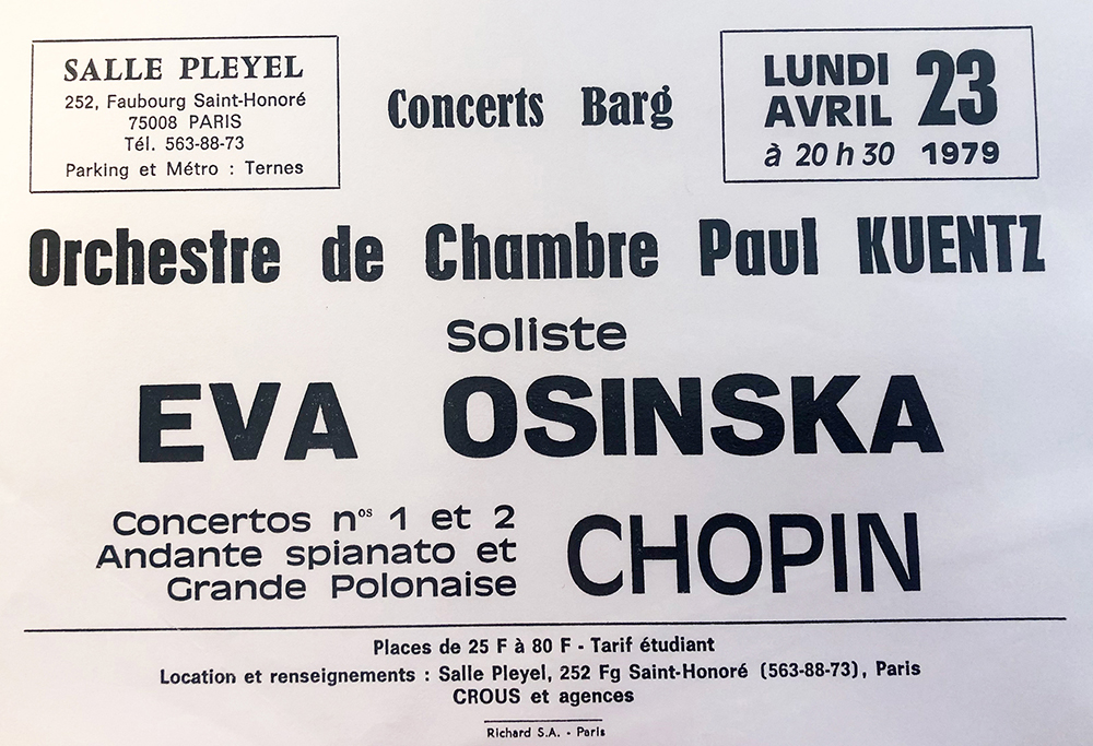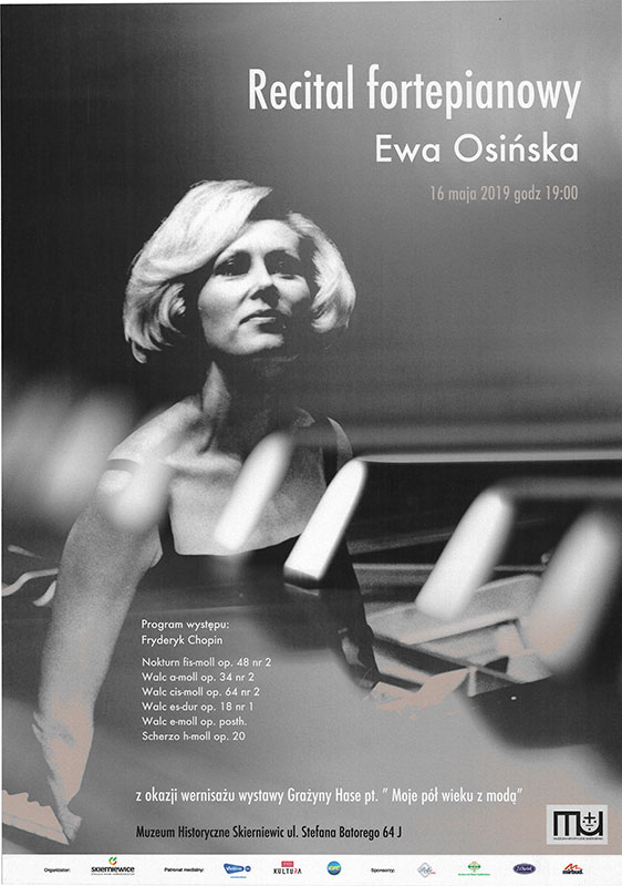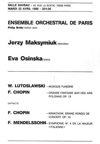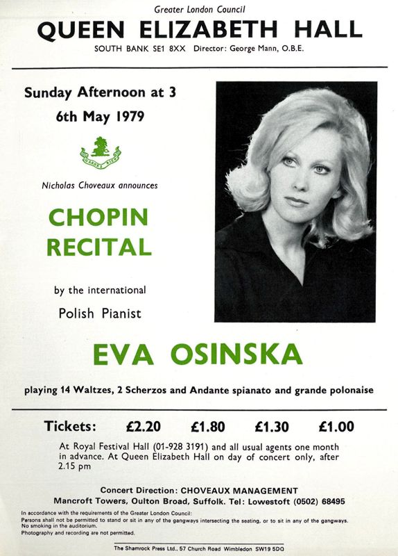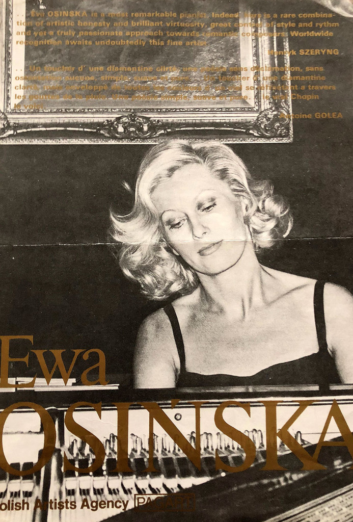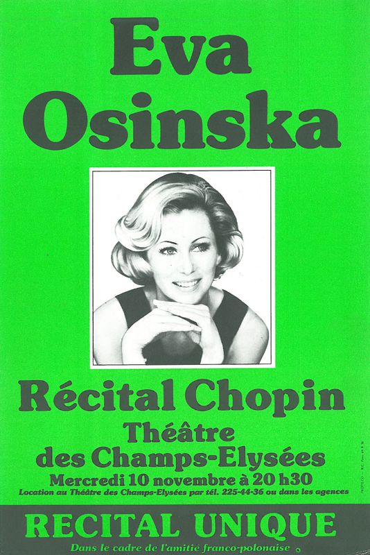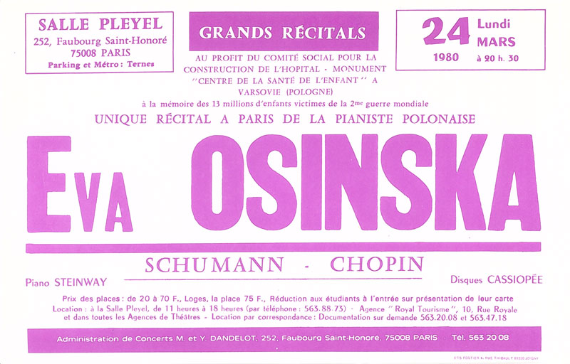 Afisze Ewa OsińskaWigmore Hall, 1969Wigmore Hall, 1977Filharmonia Narodowa, 1977Salle PleyelSalle Pleyel, 1979Theatre des Champs-Elysees, 1977Salle Pleyel, 1978Queen Elizabeth Hall, 1979Festival International Eternach, 1979Salle Pleyel, 1980Salle Poyrel, 1980Theatre des Champs-ElyseesKongreBhalle, 19811982Bunka Kaikan, 19841984Salle Gaveau, 19861986Salle de l'EmulationPaństwowa Filharmonia, 1989Salle Pleyel, 1989BBC Concert Orchestra, 1989Chatelet, 1991Salle Gaveau, 1992Majorka, 1993Moscow, 20042005Łazienki Królewskie, 2006Żelazowa Wola, 20062006Żelazowa Wola, 2008Filharmonia Pomorska, 2008Moscow, 2008Łazienki Królewskie, 2009Cyprus Symphony Orchestra, 2010Cyprus Symphony Orchestra, 2010Sala Teatru Posk, 2010Strovolos Municipal Theatre, 20102011Polska Filharmonia Pomorska, 2014Orkiestra Symfoniczna UMFC, 2014Ewa OsińskaChuansha International Piano Festival, 2016Piano Concert, 2018 do góry