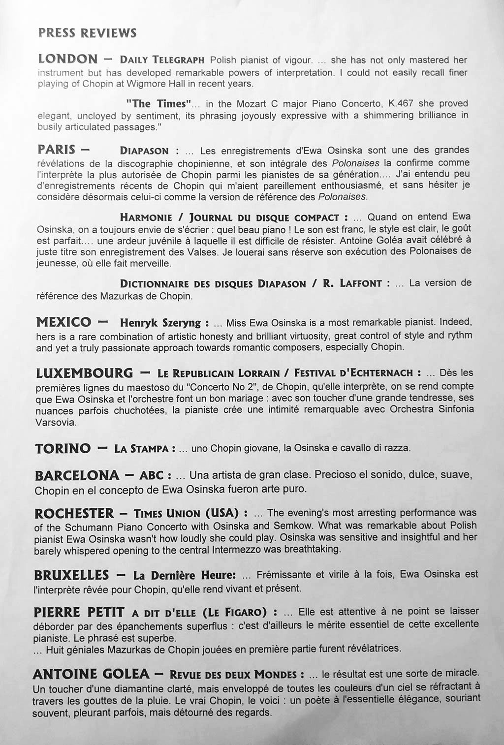 Prestiżowy słownik płytowy DIAPASON (Robert Laffont 1981) wyróżnił pierwszy w dyskografii światowej komplet 58 Mazurków F. Chopina wykonanych przez Ewę Osińską i podał jako rekomendacje wśród światowych zapisów. Chopinowskie nagrania pianistki, szczególnie Walce oraz pierwszy zestaw wszystkich Polonezów zdobyły uznanie krytyków francuskiego DIAPASON oraz DICTIONNAIRE DES DISQUES Paris.